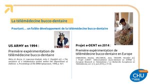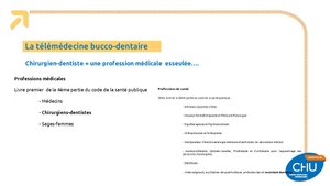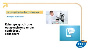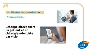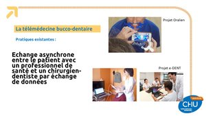 Les échanges avec le patient peuvent se faire par téléconsultation ou indirectement par l’intermédiaire d’infirmiers qui réalisent chez des personnes souvent handicapées (EMS) ou des personnes prisonnières (établissement pénitentiaire) un bilan de la santé orale (importance de la fluorescence pour le diagnostic par imagerie) avec adressage en différé des données de santé orale, dont un film de la cavité buccale. Cette pratique de la téléexpertise bucco-dentaire est financée par l’Assurance maladie depuis le 1er février 2025 (20 euros pour l’expert requis, 10 euros pour le professionnel requérant, 4 téléexpertises/an/patient).