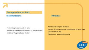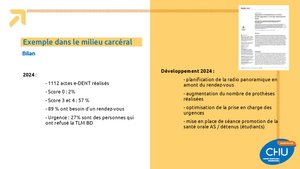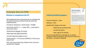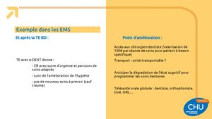Implémentation du projet E-Dent dans l’établissement depuis 2016, permettant de classer le niveau des problèmes de santé orale, les scores 3 et 4 étant pris en charge prioritairement. Un modèle organisationnel éprouvé qui pourrait se développer en France et en Europe.