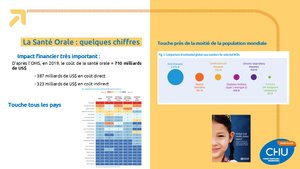La Santé Orale influe sur la santé générale. Son coût est évalué dans le monde à 710 Mds de dollars. De nombreuses maladies interfèrent avec la santé orale.