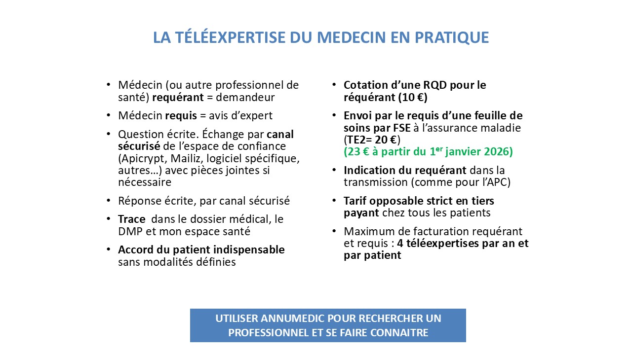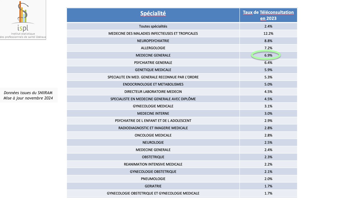 –> Données sur les pratiques de télémédecine en médecine générale. 90% des 43 millions de téléconsultations réalisées depuis 2018 jusqu’à fin 2022 ont été facturées par des médecins libéraux (généralistes et spécialistes), le taux de téléconsultation en médecine générale est de 6,9% et 2,4% pour l’ensemble des professionnels médicaux (8,8% pour les psychiatres, 12% pour les spécialistes de maladies infectieuses, 7,7% pour les spécialistes en allergologie), depuis février 2019 et jusqu’à fin 2022, 101 000 téléexpertises ont été réalisées, sur les 16 500 TE facturées à l’Assurance maladie, 15159 (91%) étaient sollicités par un médecin généraliste, dont 1211 T2,