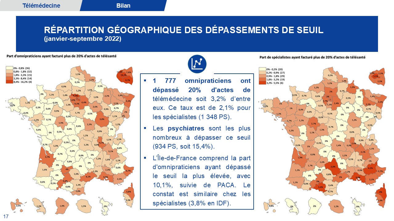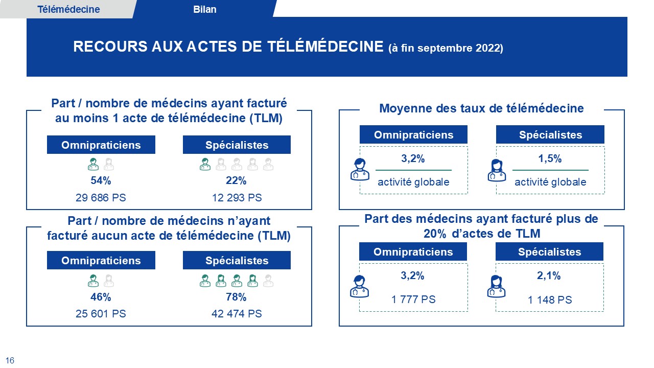 –> Les professionnels médicaux qui n’avaient jamais pratiqué de téléconsultation à la fin de 2022 : 25601 omnipraticiens (46%), 42 474 spécialistes (78%).
