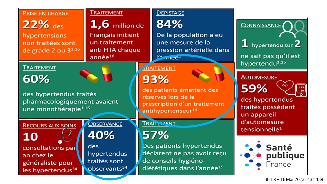 –> Données épidémiologiques sur la maladie hypertensive. La pression artérielle moyenne de la population française est de 126/77 mm hg, 1 adulte sur 3 est hypertendu (> 135/85 en auto-mesure au domicile, > 140/90 au cabinet d’un médecin ou d’une infirmière, 17 millions de français sont hypertendus, 59% des hypertendus ont un appareil d’auto-mesure, 1 hypertendu sur 2 ne sait pas qu’il est hypertendu, 1 hypertendu sur 2 est traité par une traitement pharmacologique dont 60% en monothérapie, seulement 11% des hypertendus sont suivis par un cardiologue, 10 consultations/an chez le médecin généraliste, 1,6 millions de Français initient un traitement antihypertenseur chaque année, 93% émettent des réserves lors de la prescription du traitement, 40% des hypertendus traités sont observants, 57% des patients hypertendus n’ont jamais reçus de conseils hygiéno-diététiques.